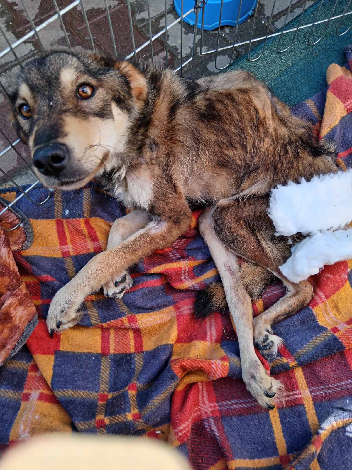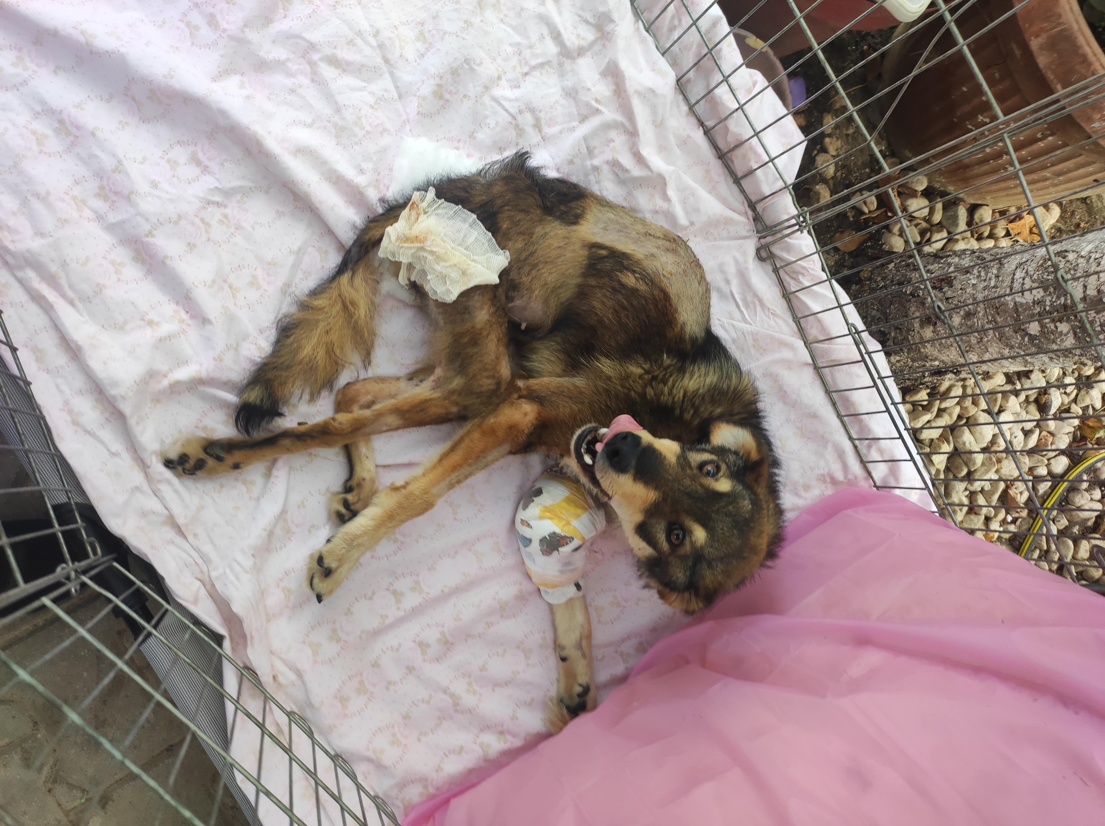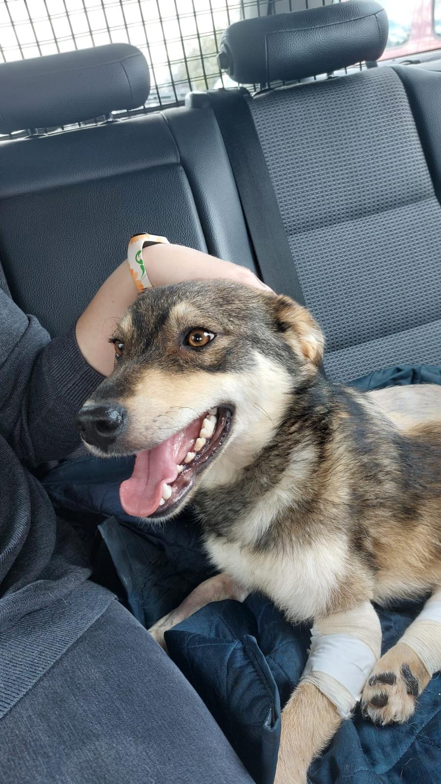 Detaillierter: An einem kalten Februarmorgen wurde unser Verein kontaktiert, weil ein Hund am Straßenrand gesehen wurde, der sich nicht bewegte und vor Schmerz heulte. Sofort machten sich unsere Freiwilligen auf den Weg, um die Situation zu überprüfen, und fanden sie – allein und in großer Not – an einer stark befahrenen Straße. Wir sahen, dass sie verletzt war, wussten jedoch nicht, wie schwer. Schnell wurde sie zu einem örtlichen Tierarzt gebracht und danach in eine besser ausgestattete Klinik.