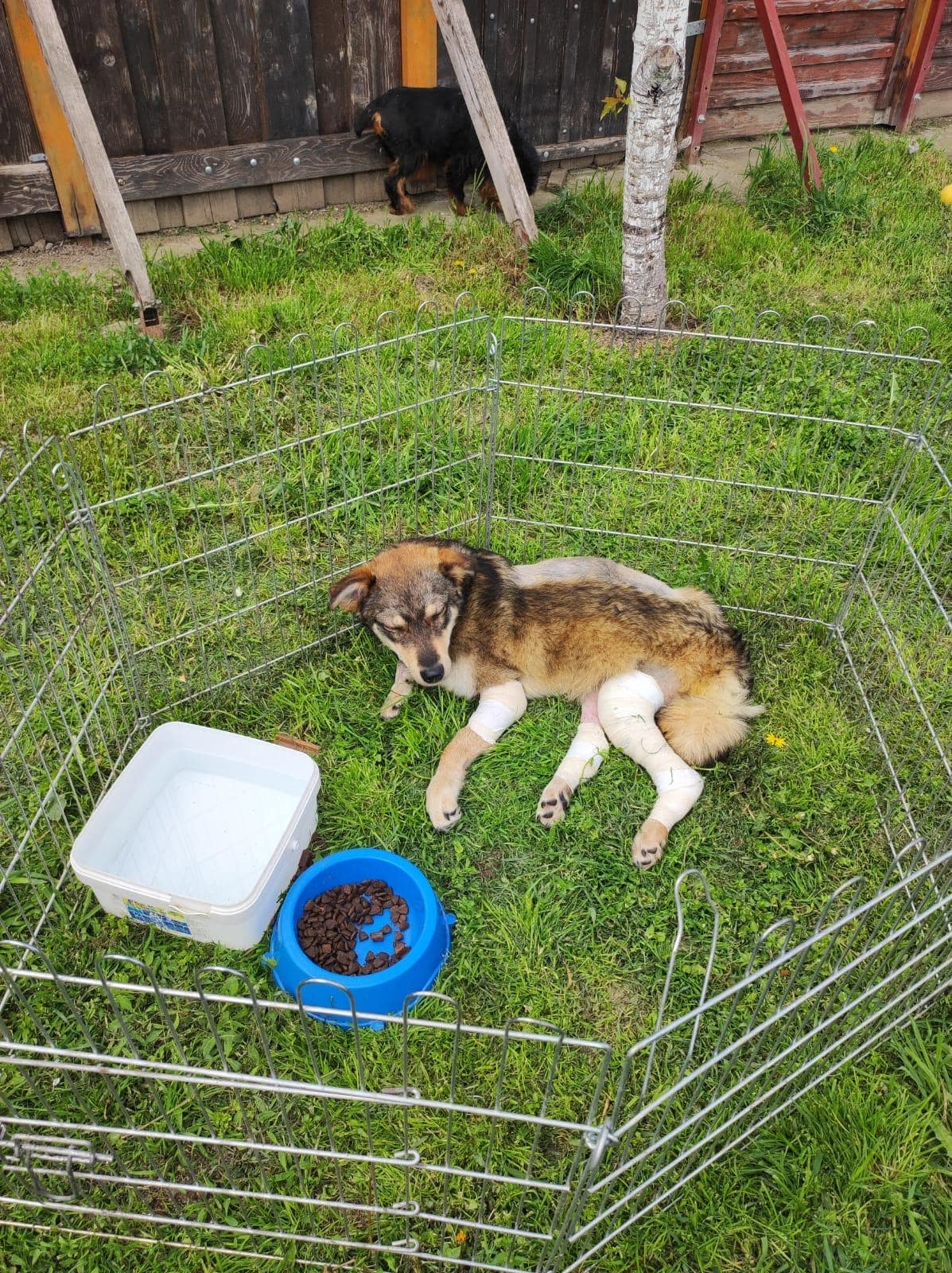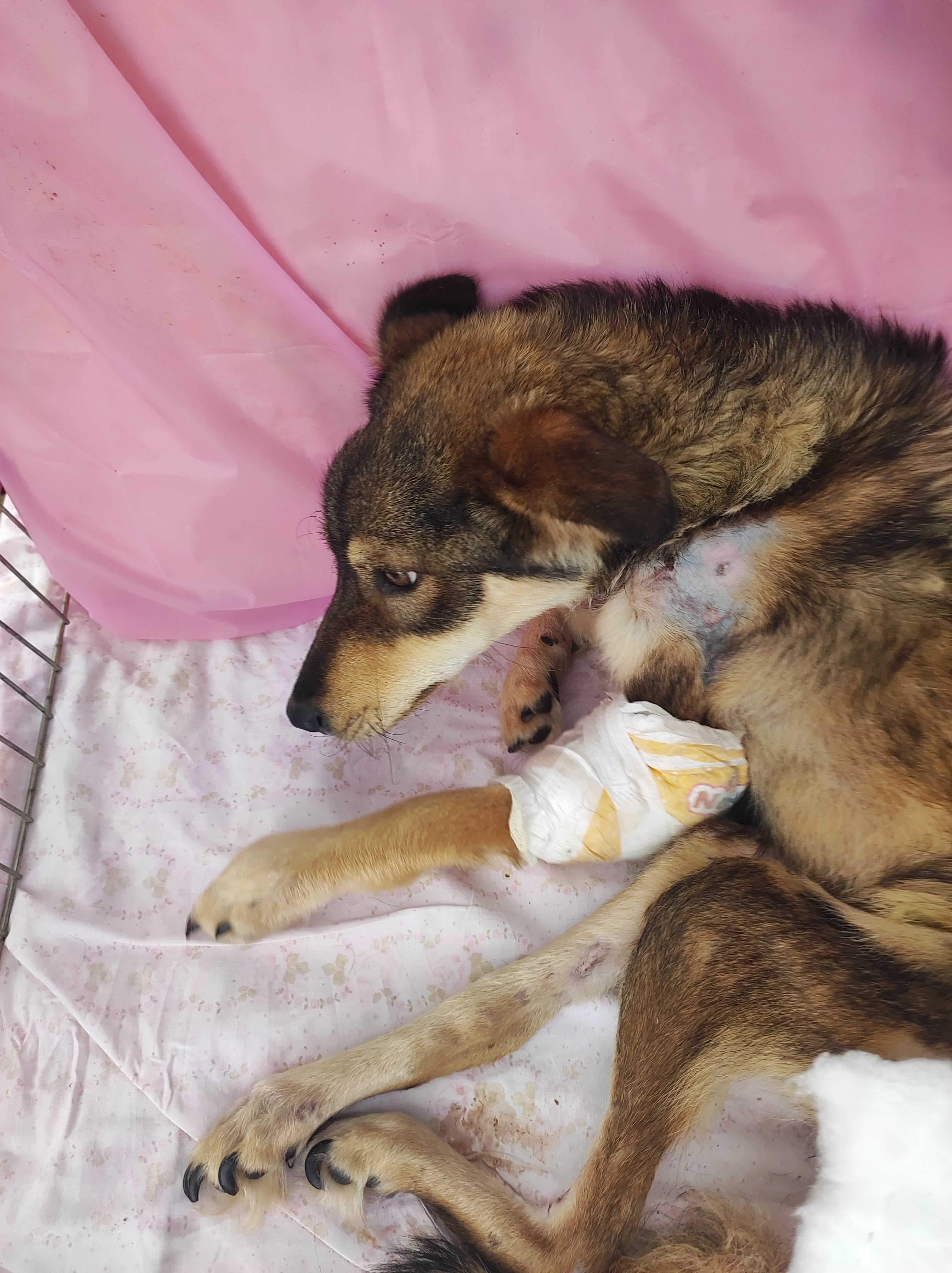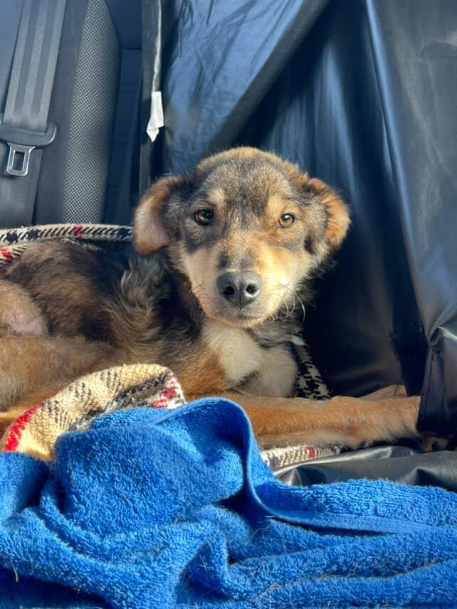 Detaillierter: An einem kalten Februarmorgen wurde unser Verein kontaktiert, weil ein Hund am Straßenrand gesehen wurde, der sich nicht bewegte und vor Schmerz heulte. Sofort machten sich unsere Freiwilligen auf den Weg, um die Situation zu überprüfen, und fanden sie – allein und in großer Not – an einer stark befahrenen Straße. Wir sahen, dass sie verletzt war, wussten jedoch nicht, wie schwer. Schnell wurde sie zu einem örtlichen Tierarzt gebracht und danach in eine besser ausgestattete Klinik.